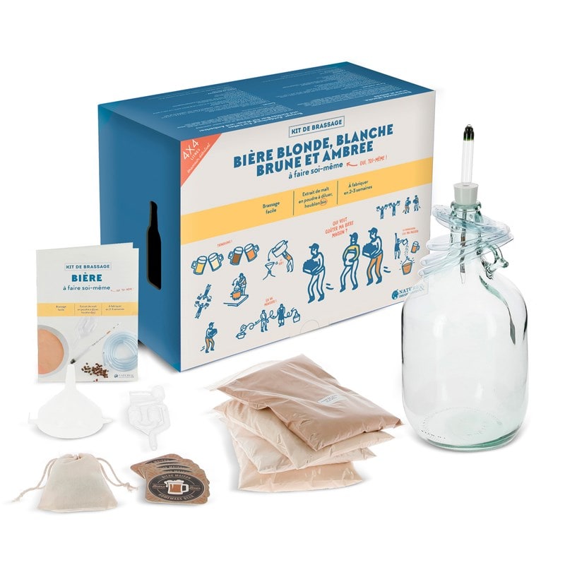 Kit pour faire sa bière maison. Kit de brassage kit de bière. Ce kit contient. La recette simple par infusion mono palier vous permettra de réaliser 4 litres de bière blonde de type ale.