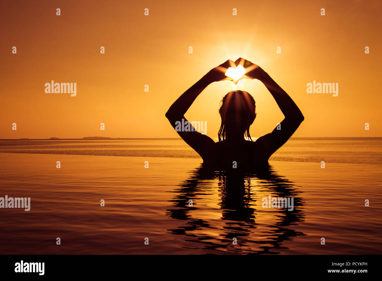 Fille Faisant Coeur Avec Ses Mains Sur Fond De Mer Avec Un Beau Coucher De Soleil Doré Silhouette De Bras Féminin En Forme De Coeur Avec Le Lever Du