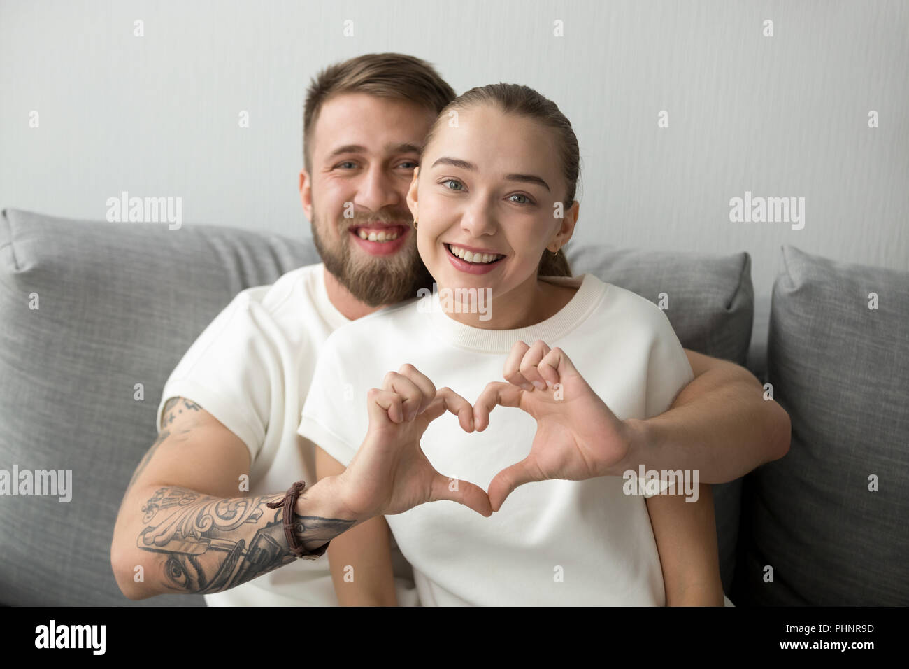 Portrait Of Happy Couple Hugging Faire Coeur Avec Les Mains